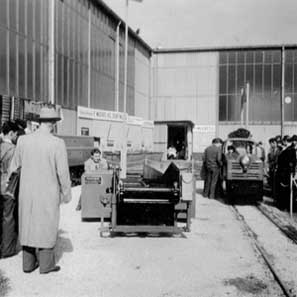 | 2x Bilder Bergbaumesse Essen (um 1950) Erste Erprobungsfahrt des "Shuttle cars" als Fahrer Bernhard Thyes |