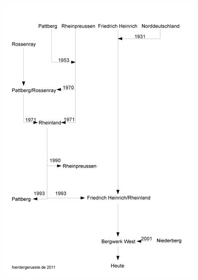 | 2002 | 01.01. Zusammlegung mit dem Grubenfeld der stillgelegten Zeche Niederberg. Umbenennung von Friedrich Heinrich/Rheinland in Bergwerk West |