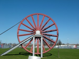 Die im April 2003 als Denkmal aufgestellte Seilscheibe am Förderstandort Mevissen I/II stammt von der benachbarten Schachtanlage Niederberg, welche Ende 2001 stillgelegt wurde.